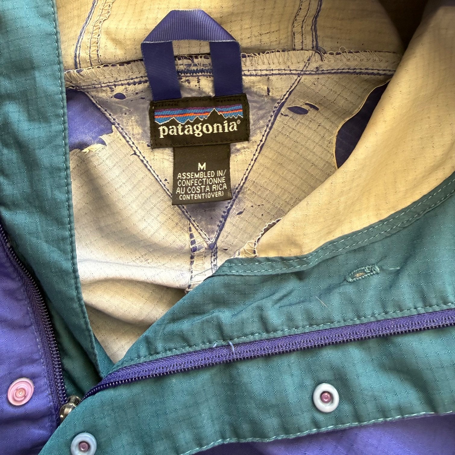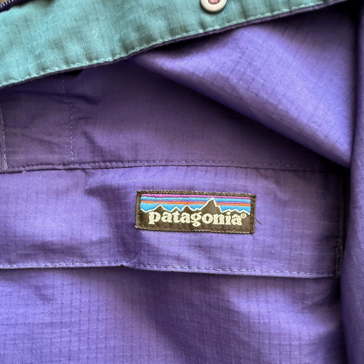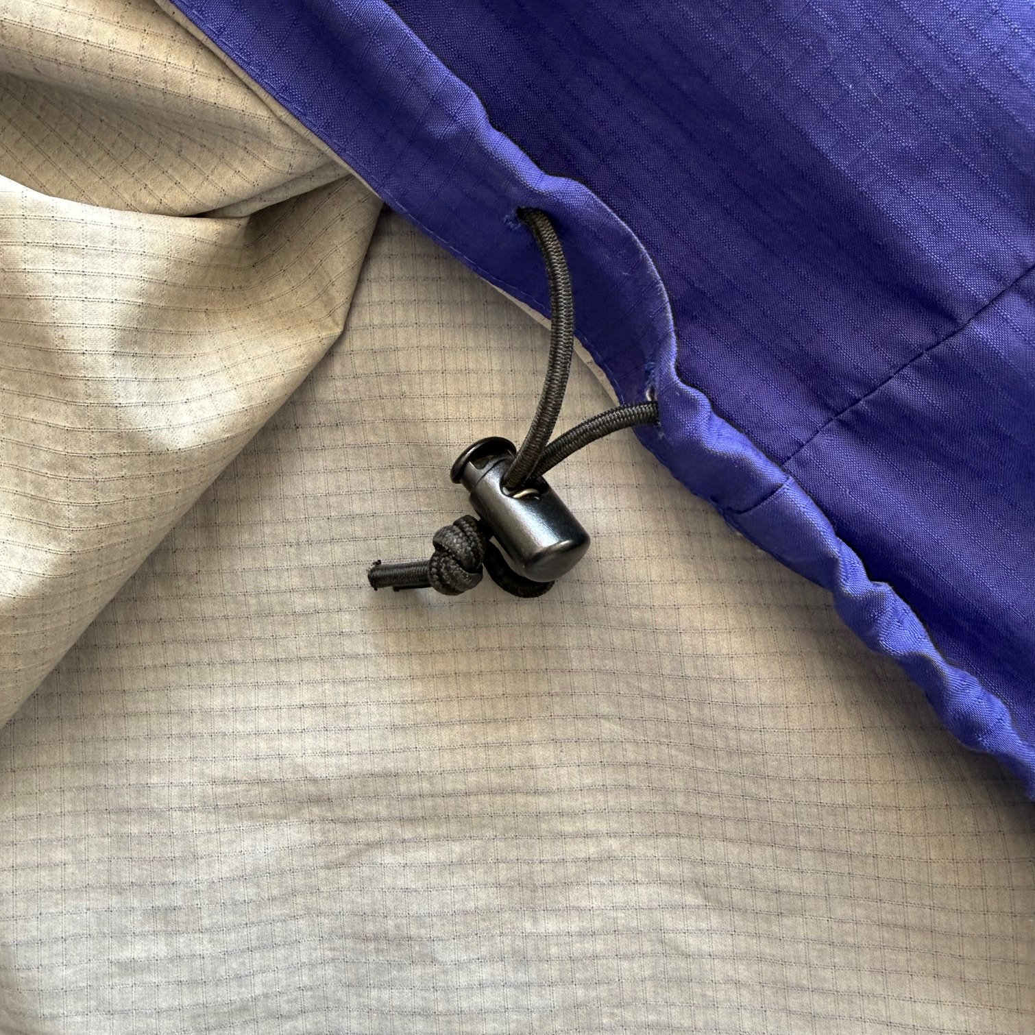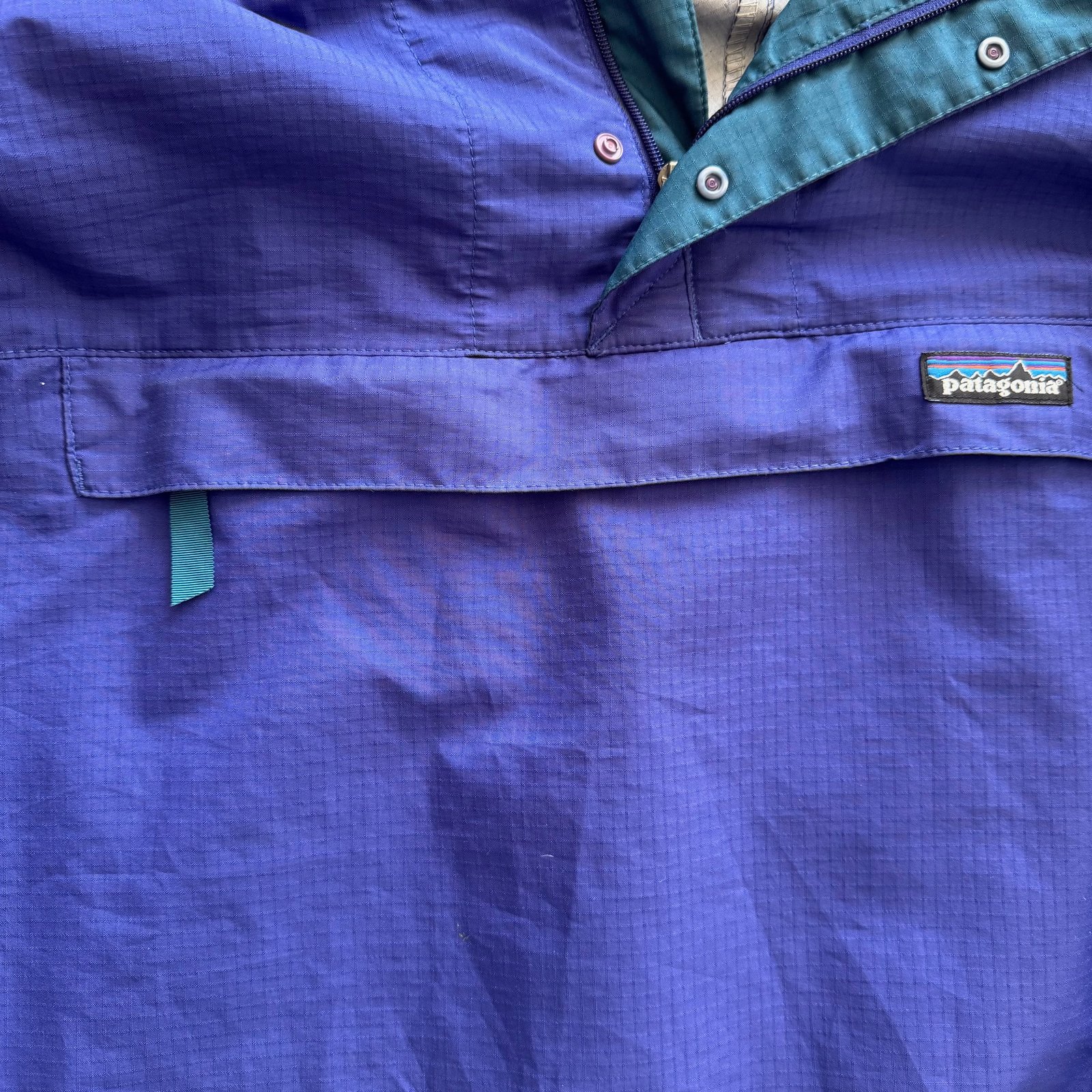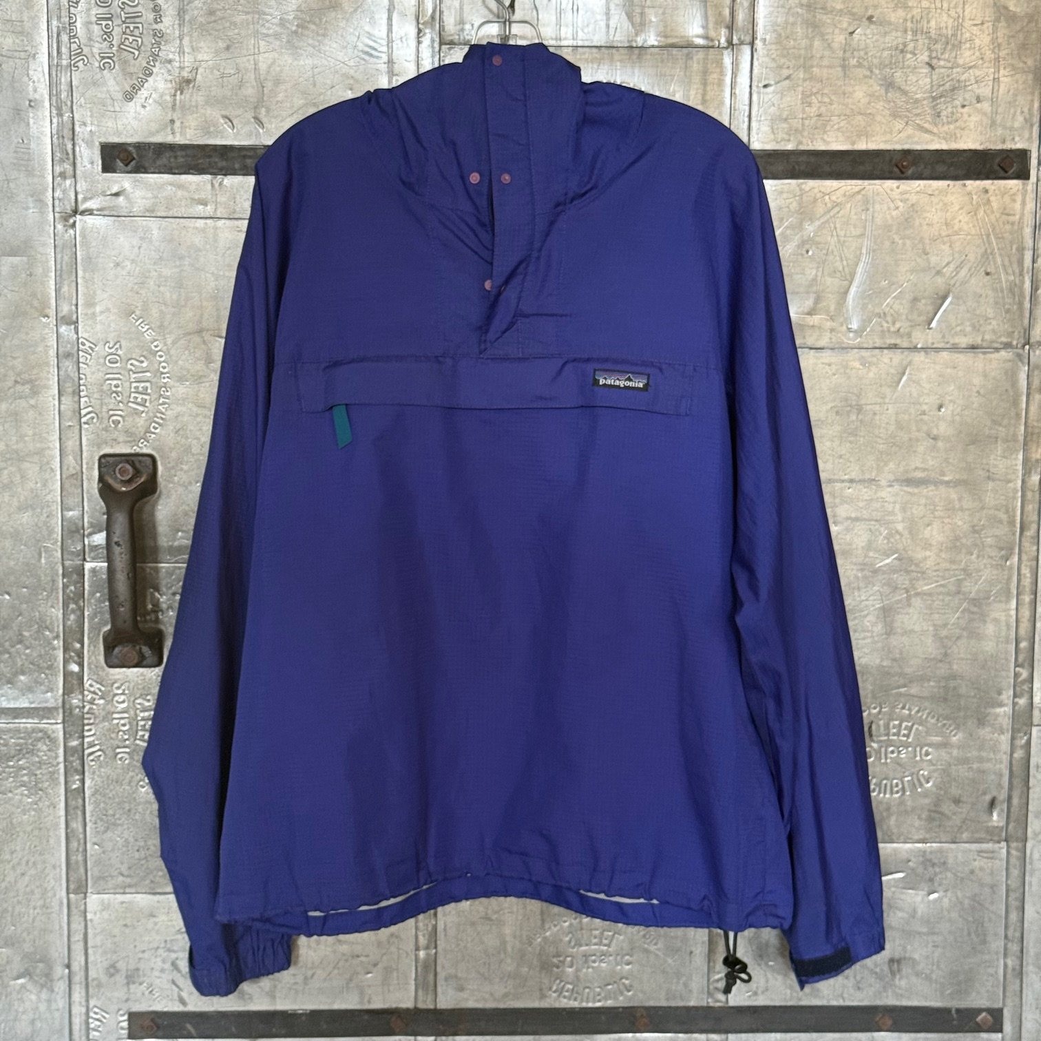 Featherweight shell with the kangaroo pocket and a hood that has an adjustable strap-down. Light wear around the interior neck area commensurate with age and wear but otherwise in perfect condition.
