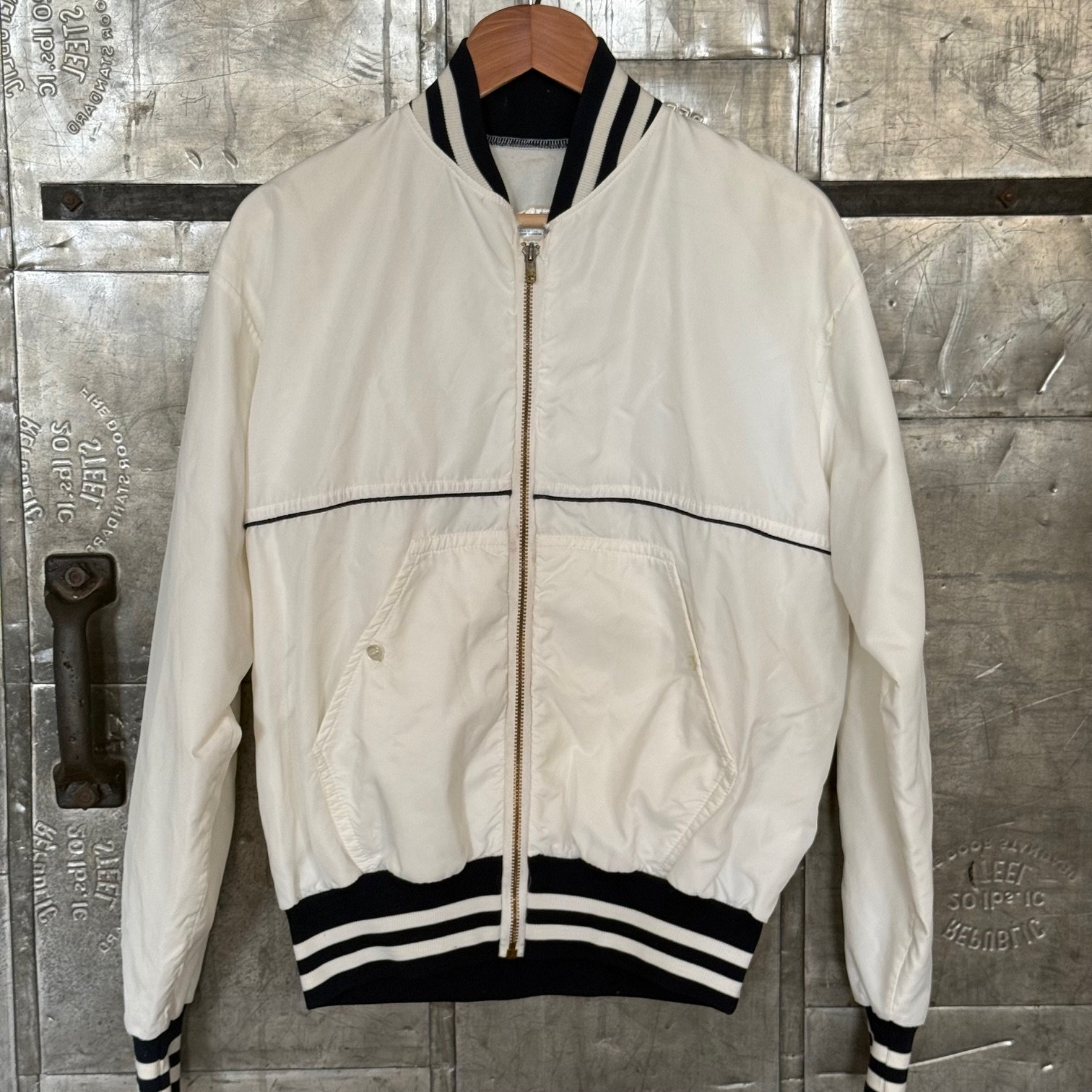 70’s satin bomber from iconic old school manufacturer, Felco. In terrific condition for its age. With both mother of pearl jacket buttons, and nice fading on the brass zipper. Super clean for layering or kicking around the city.